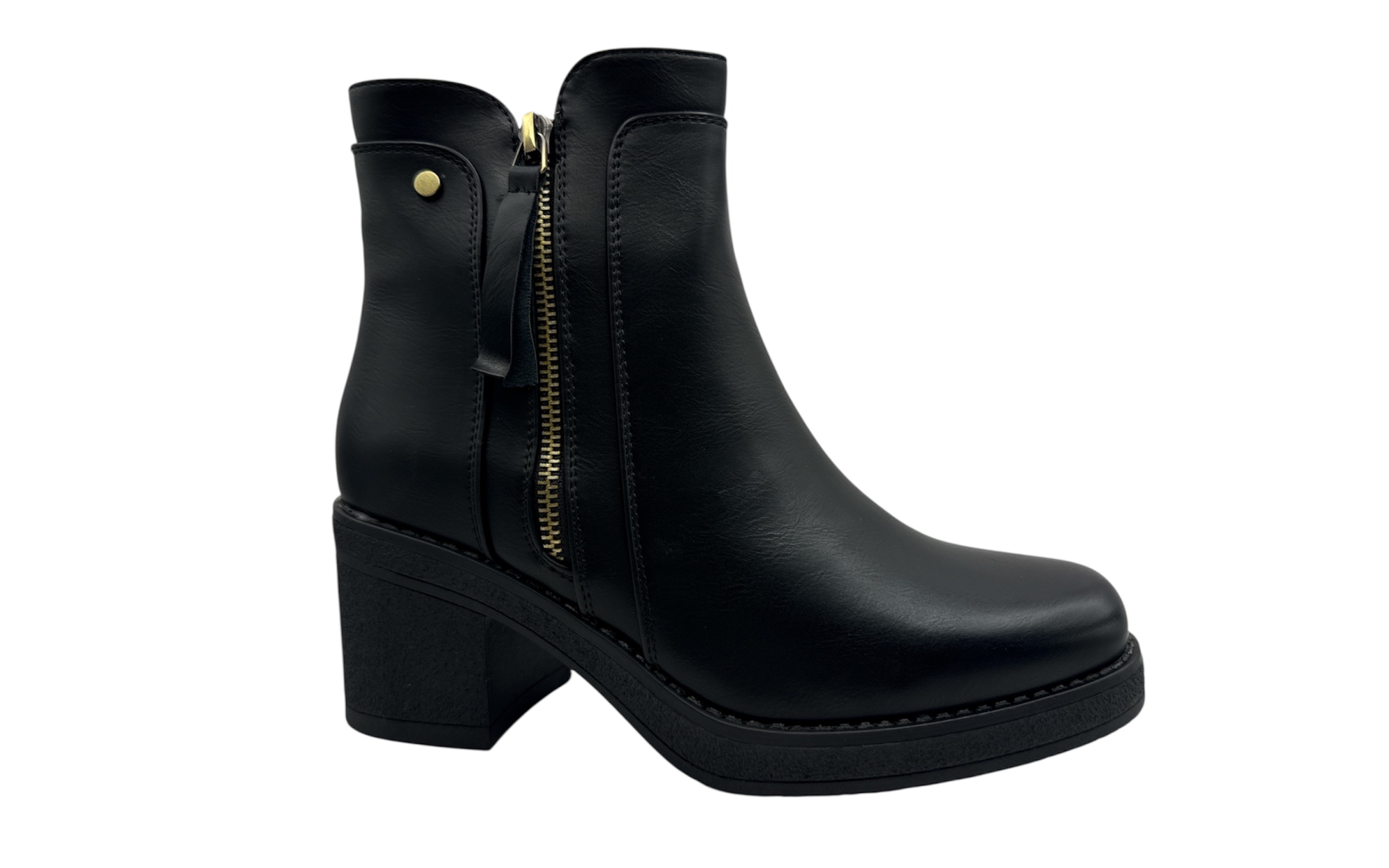 Este producto es un botín elegante de color negro, diseñado para ofrecer un equilibrio perfecto entre comodidad, estilo y versatilidad. El botín está confeccionado en material sintético de alta calidad que imita la textura del cuero, lo cual le otorga un acabado sofisticado y resistente al uso diario. Su diseño minimalista destaca por una silueta limpia y moderna, ideal para combinar con diferentes estilos de vestimenta, desde un look casual hasta uno más formal.
