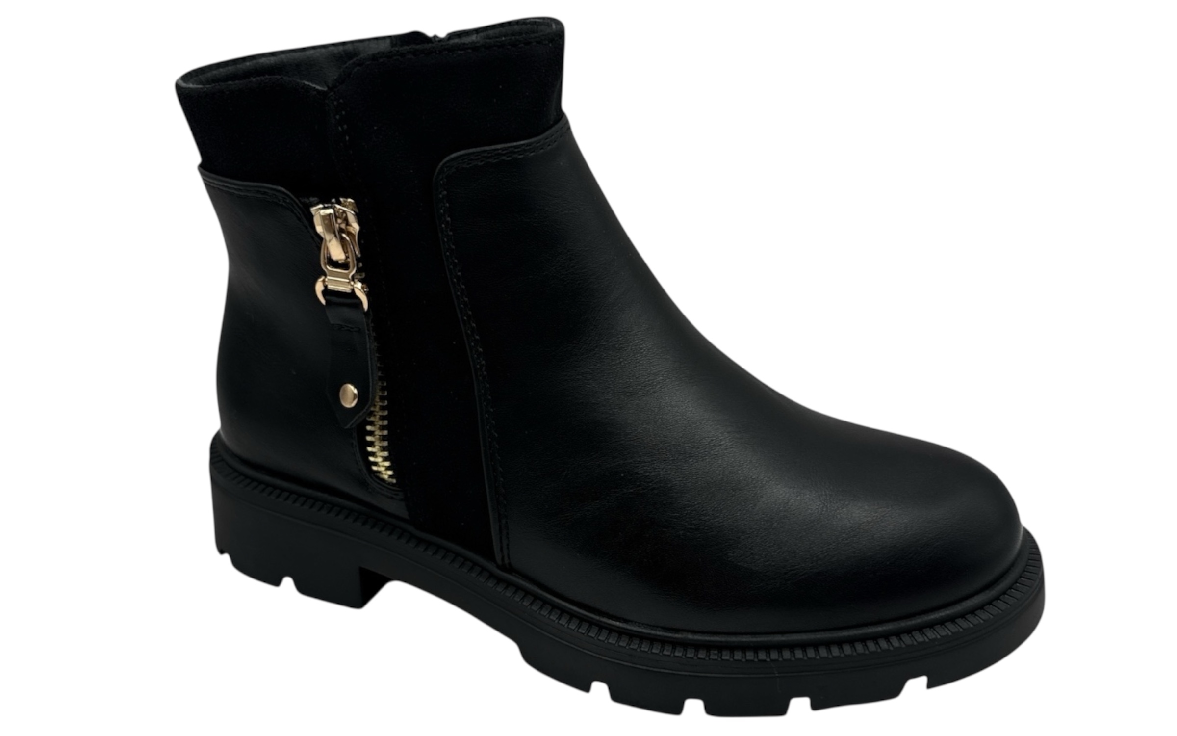 El diseño incluye una cremallera lateral que facilita poner y quitar el botín de manera práctica y rápida, pensada especialmente para las niñas que buscan independencia al vestirse. Además, esta cremallera cuenta con detalles metálicos dorados que le aportan un toque moderno y sofisticado, resaltando su estilo juvenil y chic. La suela es de goma antiderrapante, con un diseño dentado que brinda mayor seguridad y estabilidad al caminar, evitando resbalones en distintas superficies.