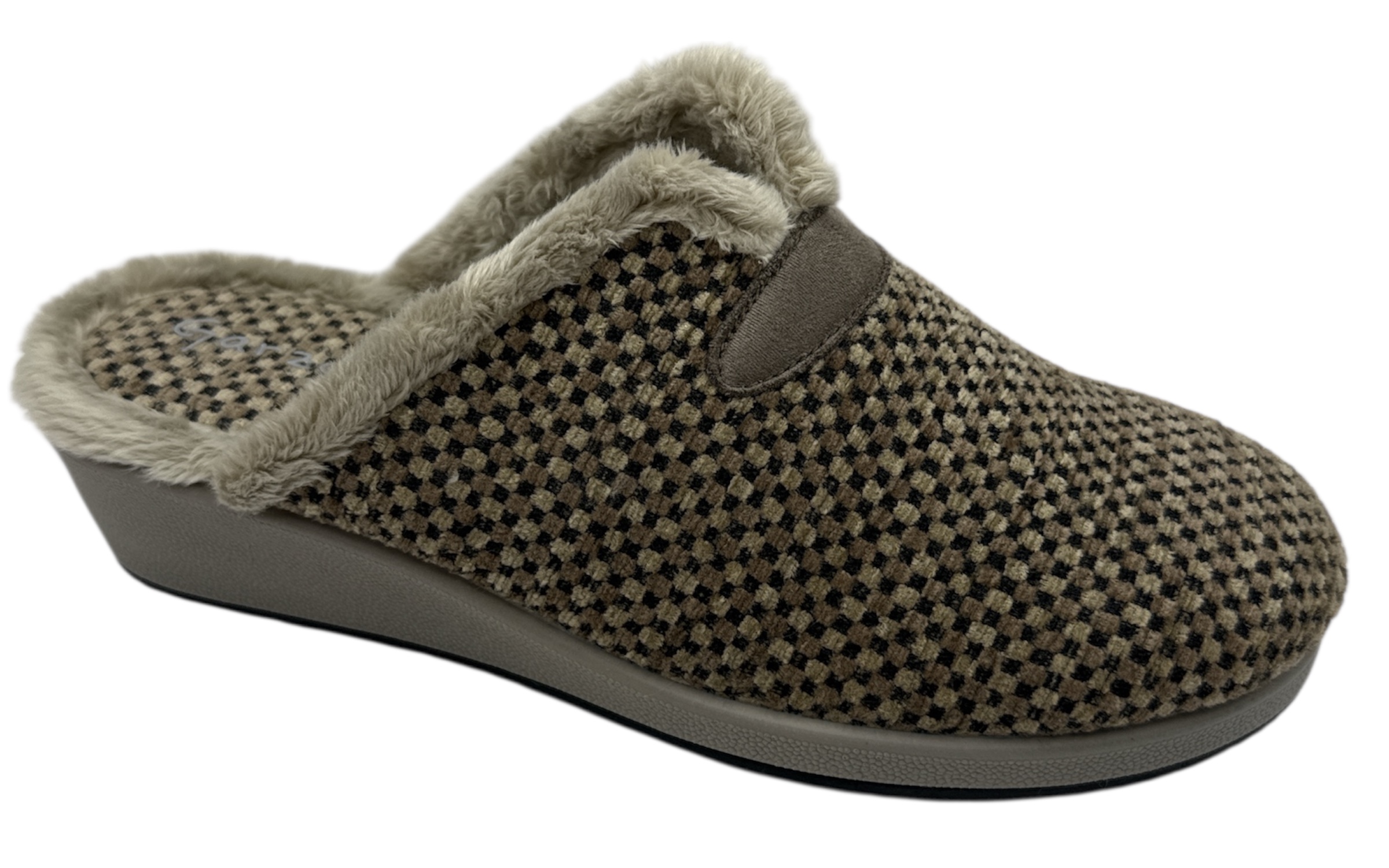 El exterior presenta un elegante estampado de pequeños cuadros en tonos beige y negro, aportando un estilo clásico y versátil que encaja con cualquier atuendo de estar por casa. Su borde interno está recubierto de un pelito extremadamente suave, que proporciona una sensación acogedora desde el primer contacto. Cada detalle está pensado para ofrecer un interior comfortable, envolviendo el pie con una suavidad excepcional durante horas.