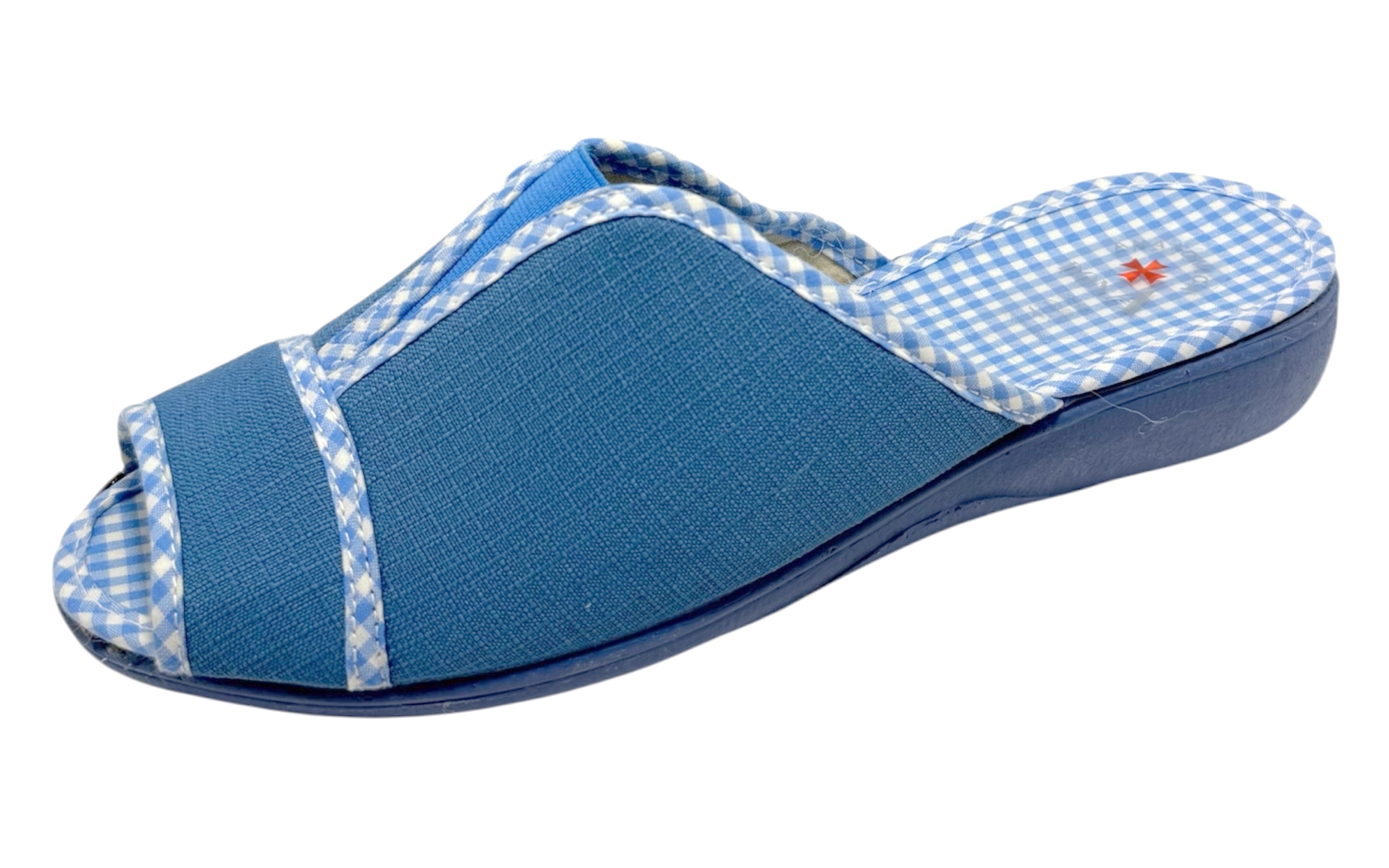 Está elaborada en tejido textil suave y resistente de color azul, que proporciona una agradable sensación al contacto con el pie. Este PRODUCTO incorpora un elástico central que facilita el ajuste y permite que la zapatilla se adapte cómodamente al pie al ponérsela. Además, presenta un elegante detalle de vivo con estampado vichy que aporta un toque tradicional y decorativo.