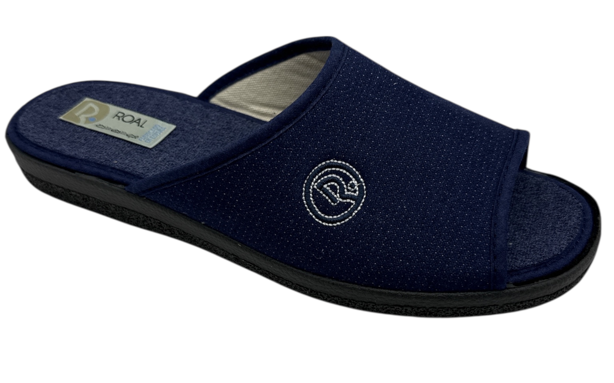 Zapatilla de casa para hombre color azul marino, con diseño abierto en la puntera y acabado en tejido suave microperforado. Cómoda plantilla acolchada y suela BIO antideslizante. Ideal para el uso diario en interiores, ofrece confort, frescura y durabilidad. Fabricada en España.ROAL https://calzadosroal.com/es/