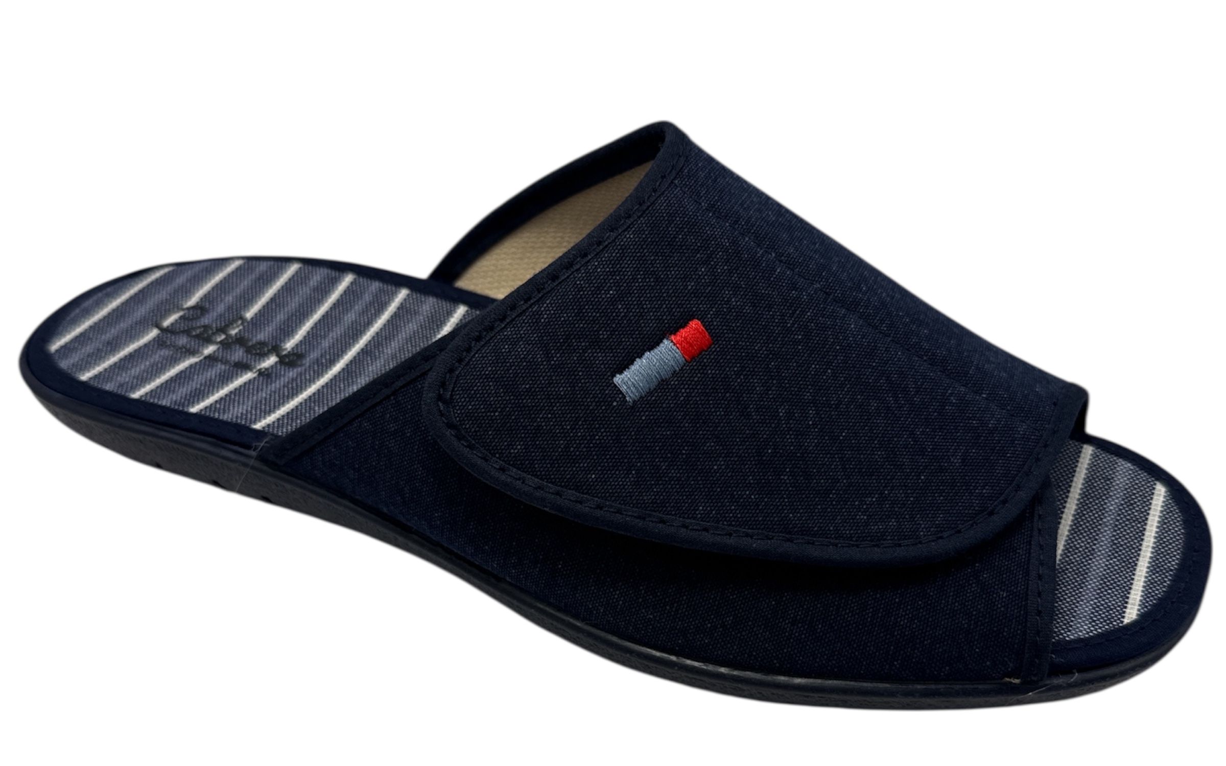 Esta zapatilla de casa de Vulcanizados Cabrera representa la unión perfecta entre funcionalidad y confort artesanal. Diseñada meticulosamente en España, destaca por su sistema de cierre mediante velcro ajustable, lo que permite una adaptación total a cualquier tipo de empeine, siendo la solución ideal para pies que requieren un extra de holgura o sufren de inflamación. Su estética combina un elegante tejido exterior en azul marino con un discreto bordado lateral, sello distintivo de la marca que garantiza su autenticidad y excelencia. La planta interior presenta un diseño de rayas clásicas que aporta un toque visual fresco, mientras que su puntera abierta asegura una óptima transpiración. Fabricada con materiales de primera categoría y una suela vulcanizada flexible, esta zapatilla garantiza durabilidad y una pisada segura. Es la elección perfecta para quienes buscan el bienestar diario y la calidad de la fabricación nacional en un calzado doméstico versátil y duradero.