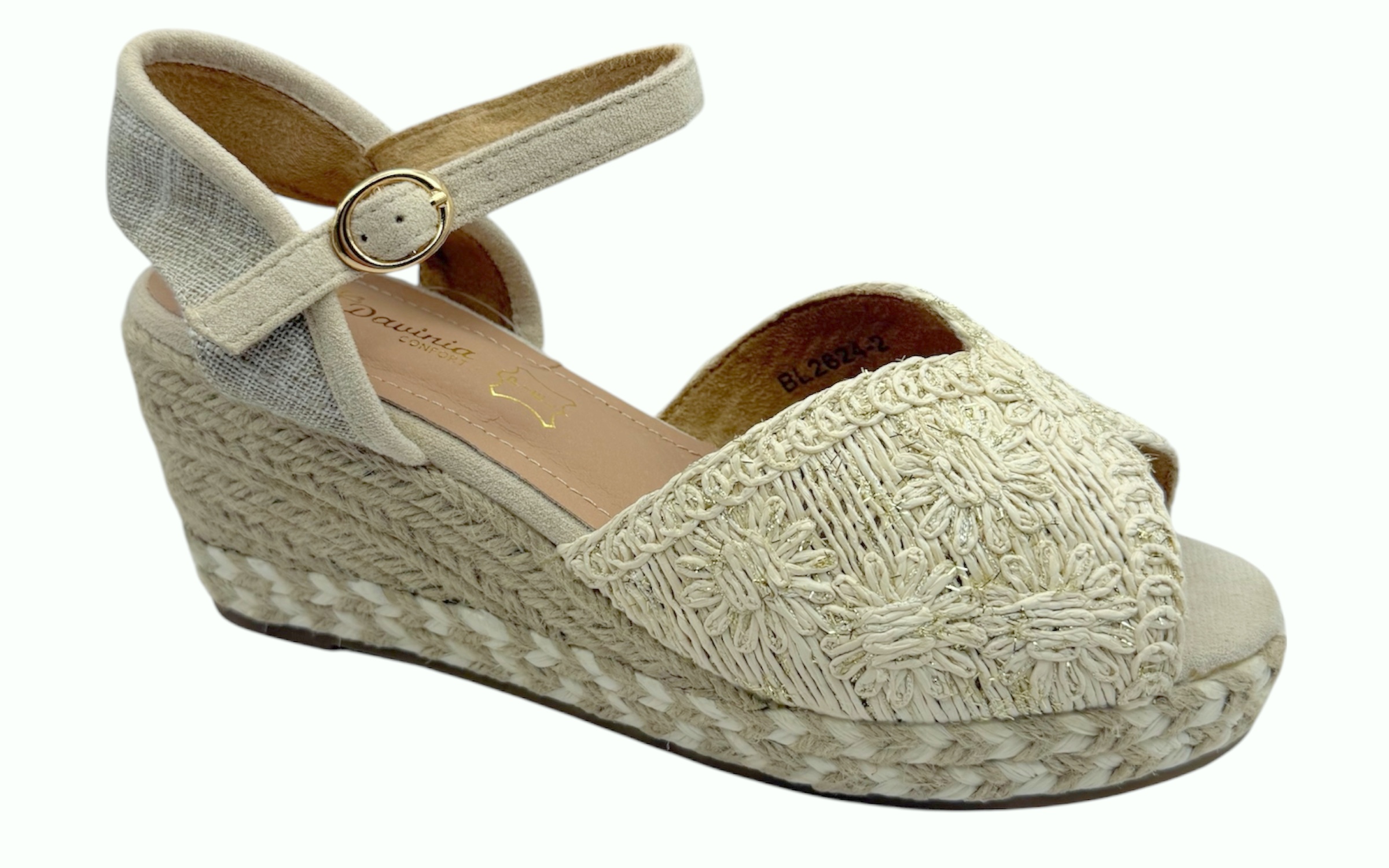 Su diseño de dedo descubierto permite una mayor libertad y frescura, ideal para los días más calurosos. Para asegurar una sujeción perfecta al caminar, incorpora una correíta al tobillo ajustable mediante una hebilla metálica dorada, que combina a la perfección con el tejido en tono beige. El interior cuenta con una planta acolchada que garantiza el bienestar en cada paso. Es el calzado perfecto para quienes buscan naturalidad, altura y una comodidad superior en un solo modelo.