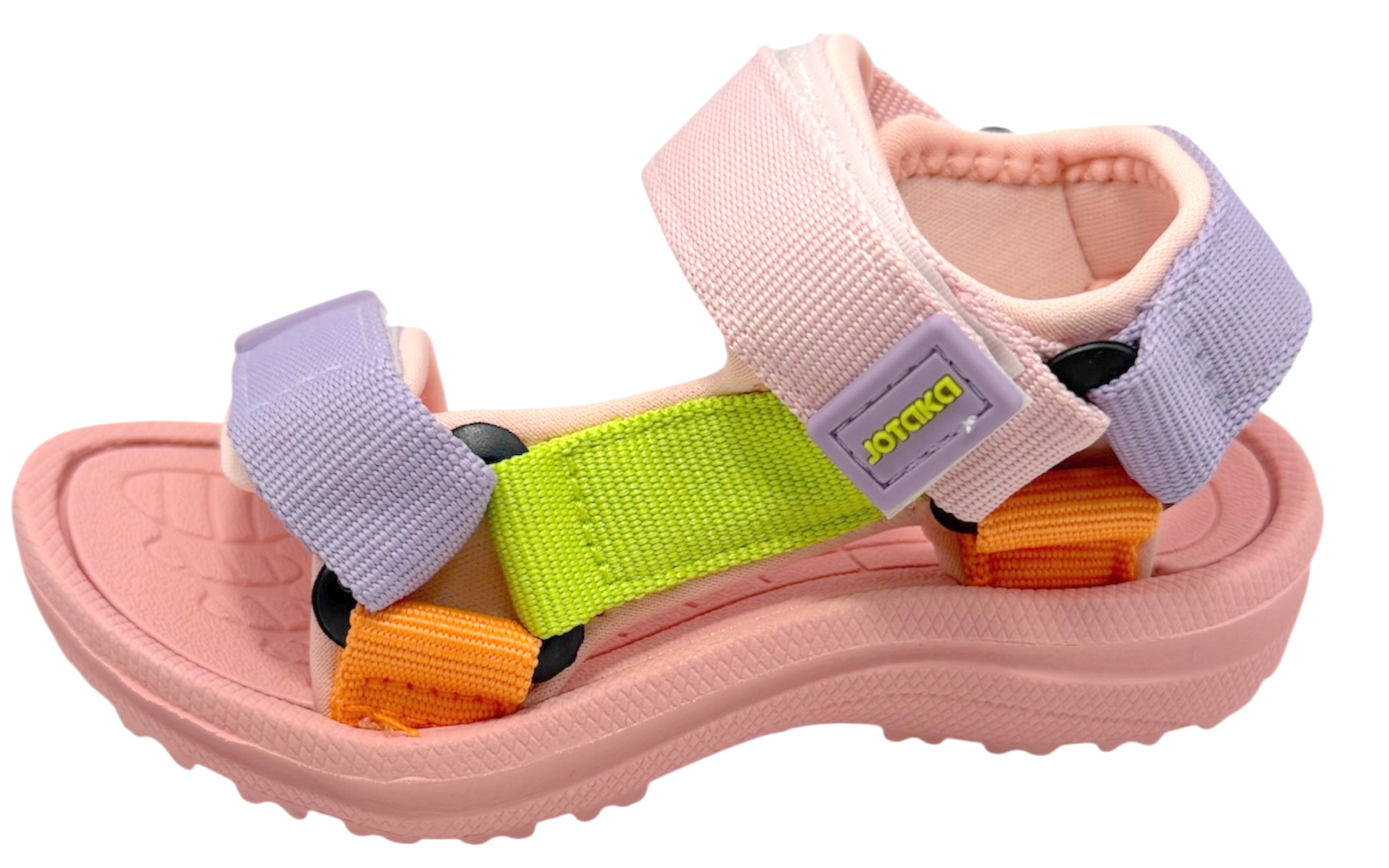 Este producto es una sandalia deportiva infantil de estilo casual diseñada para ofrecer comodidad y sujeción durante actividades diarias y al aire libre. Está fabricada con una suela gruesa de goma que aporta estabilidad y resistencia al desgaste. La plantilla interior es rosa y acolchada, con pequeñas perforaciones que podrían ayudar a la ventilación del pie.