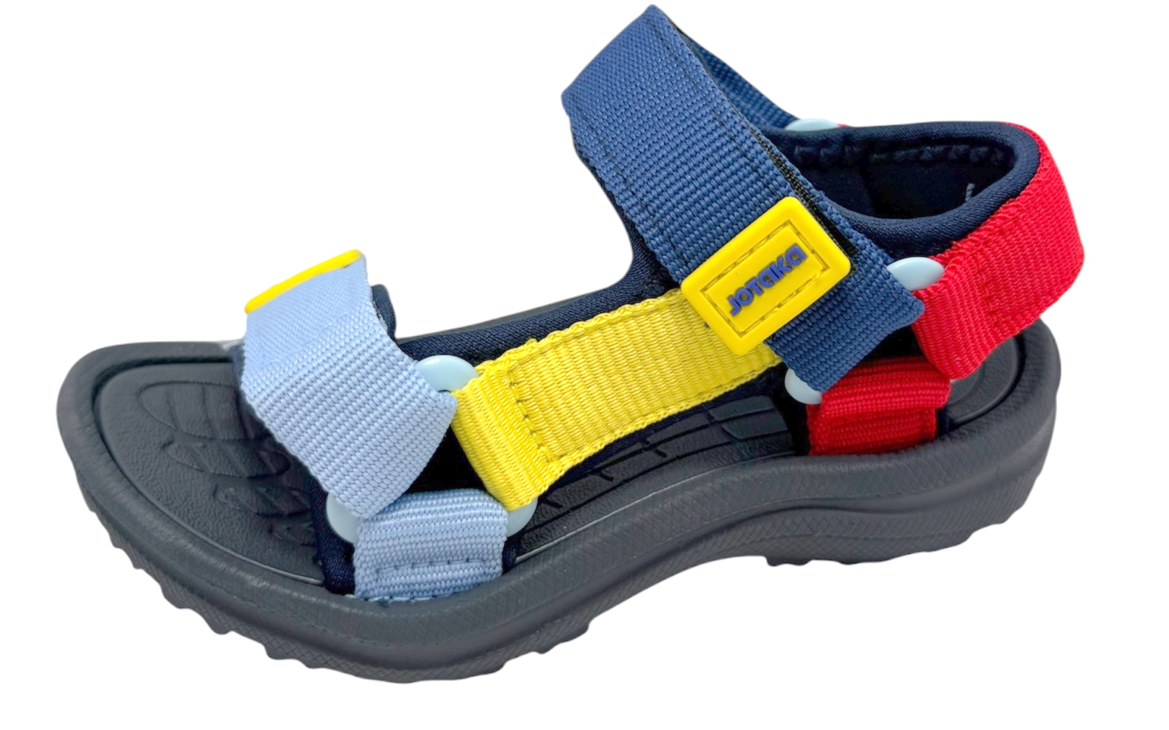 Este producto es una sandalia deportiva infantil de estilo casual diseñada para ofrecer comodidad y sujeción durante actividades diarias y al aire libre. Está fabricada con una suela gruesa de goma oscura que aporta estabilidad y resistencia al desgaste. La plantilla interior es azuly acolchada, con pequeñas perforaciones que podrían ayudar a la ventilación del pie.