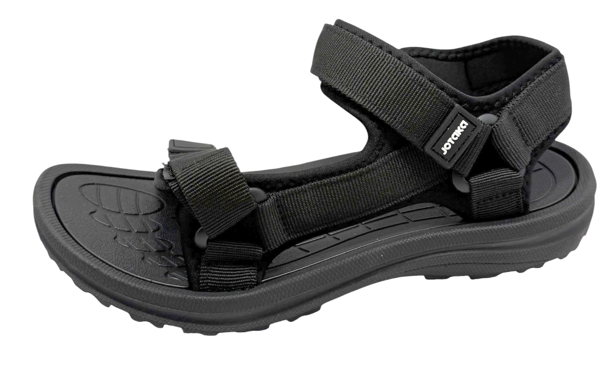 Este producto muestra una sandalia de color negro con un diseño práctico y deportivo. Está fabricada principalmente con materiales sintéticos y correas de tela resistente que aseguran el pie de manera cómoda. La sandalia cuenta con varias tiras ajustables con cierre de velcro, lo que permite adaptarla fácilmente al tamaño y forma del pie. Una de las correas pasa por la parte delantera, otra por el empeine y una más rodea el talón para proporcionar mayor estabilidad al caminar. En uno de los laterales se observa una pequeña etiqueta con la marca.