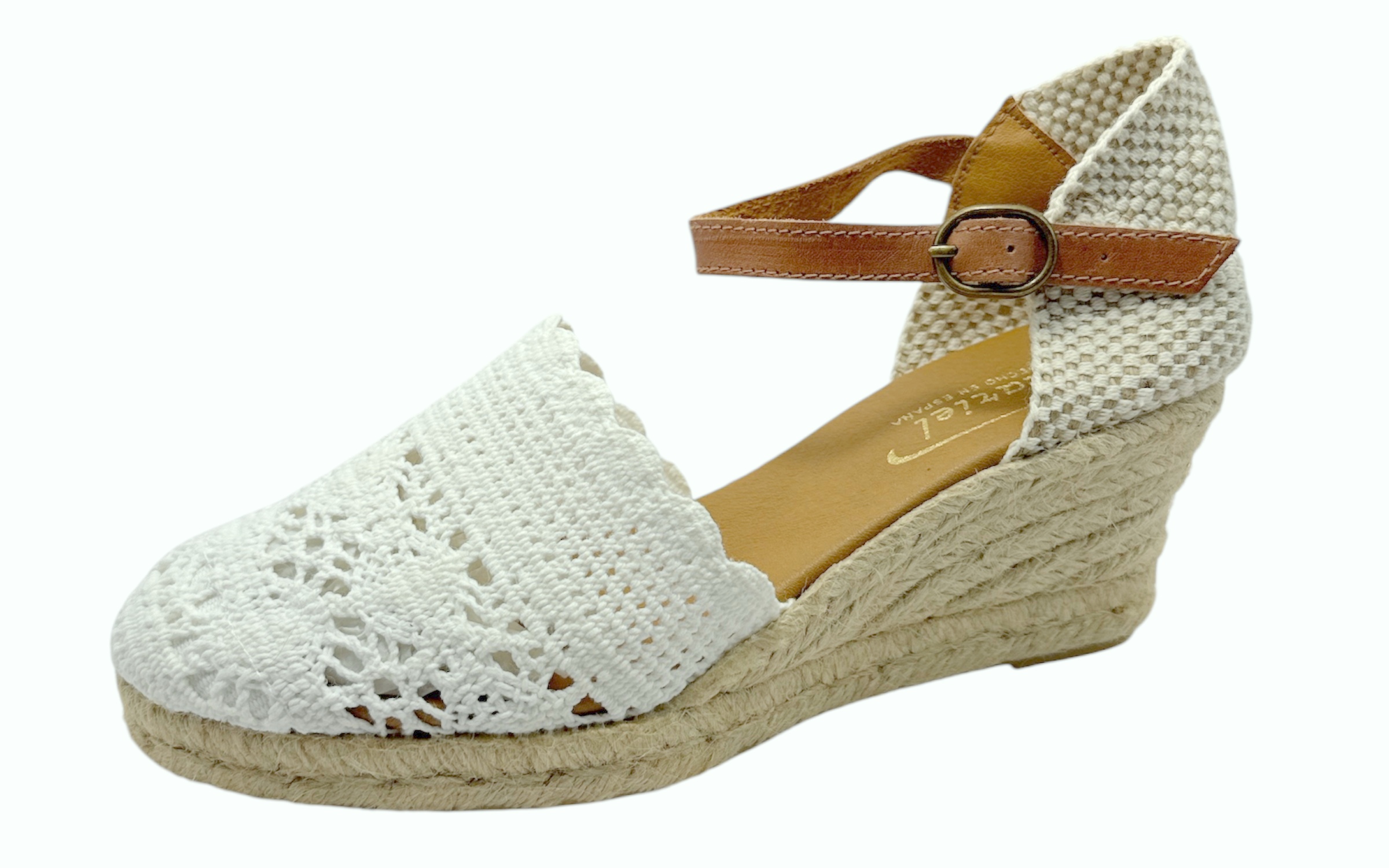 Esta alpargata de cuña de la firma Mariel, fabricada íntegramente en España, destaca por su elegante combinación de texturas y su diseño artesanal. El modelo presenta una sofisticada pala confeccionada en encaje de algodón blanco, que aporta un aire romántico y una excelente transpirabilidad para los días más calurosos.La cuña está compuesta por 5 cuerdas de cáñamo natural trenzado, proporcionando una altura estilizada sin comprometer la comodidad. Para asegurar el máximo confort, incorpora una planta de gel de algodón, diseñada para amortiguar la pisada y ofrecer una sensación de frescura y suavidad continua al caminar.El diseño se completa con un talón de tejido calado en contraste y un cierre clásico mediante correita de piel que se anudan al tobillo, garantizando una sujeción perfecta y un estilo femenino atemporal. Es el calzado ideal para quienes buscan calidad, diseño artesano y una comodidad técnica superior en una sola pieza.