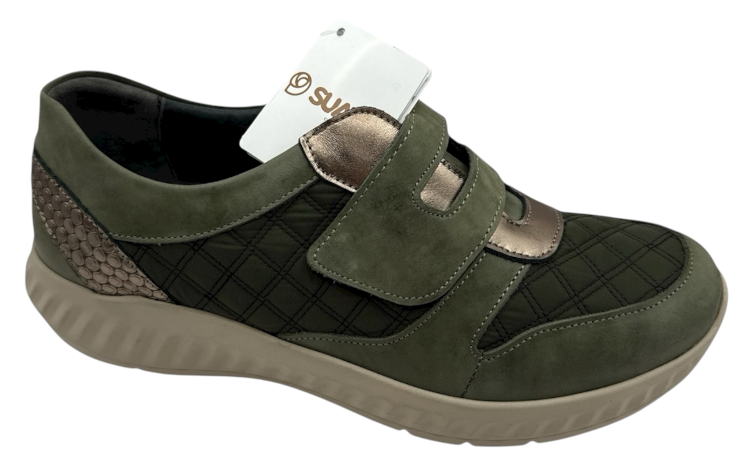 El diseño combina elegancia y modernidad, con un acabado en tonos verdes y detalles metalizados que aportan un aire actual y distintivo. Además, el patrón acolchado en la zona superior añade un toque único y sofisticado, manteniendo la esencia práctica y versátil que caracteriza a los zapatos de Leuland-Suaves.
