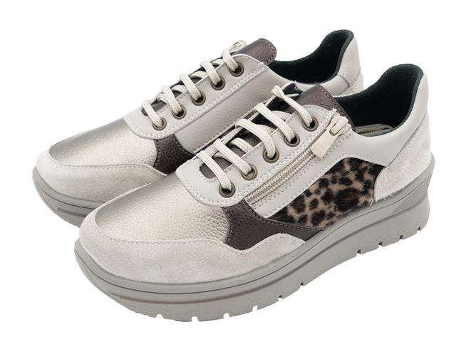 Este producto es un zapato deportivo de mujer fabricado en España por la marca Roal, que destaca por su diseño actual, gran comodidad y calidad en los materiales. Está elaborado en piel serraje de primera calidad, combinada con diferentes texturas y detalles en tonos beige y marrón, realzados con un atractivo estampado animal en el lateral que aporta estilo y un toque de originalidad. Es un calzado versátil, perfecto para combinar con atuendos urbanos y casuales, sin renunciar al confort.
